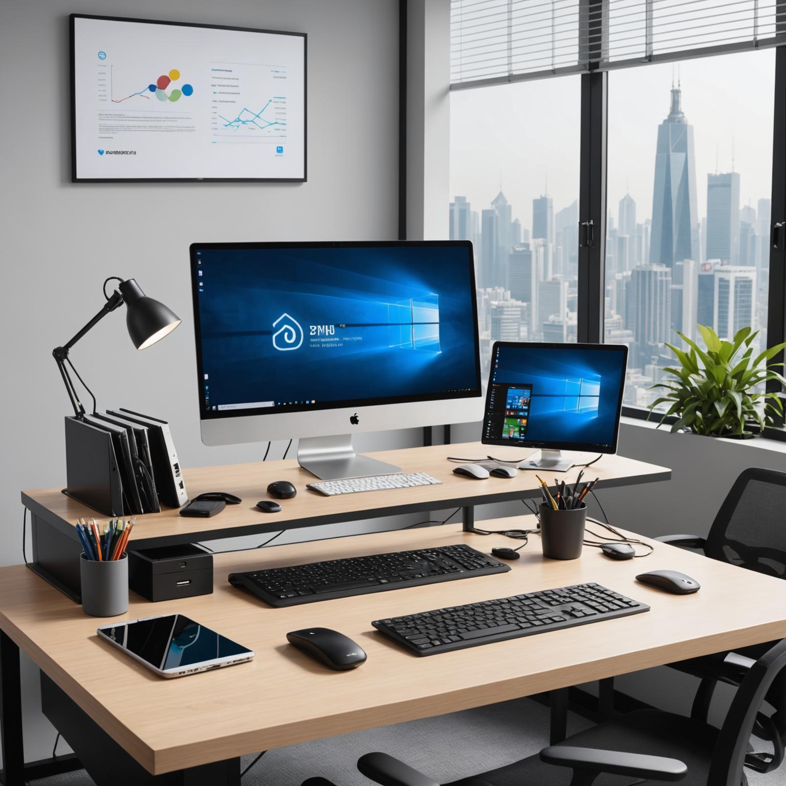 Moreover, the aesthetic appeal of this setup is notably enhanced by accessories that echo contemporary style, from minimalistic keyboards and mice to ergonomically designed components. Strategic placement of plants and curated office essentials bring a touch of nature, while savvy lighting fosters creativity and focus. It’s a testament to how effectively chosen technology and meticulously selected workspace accessories can make a profound impact, transforming an office from a mere workspace into a haven of innovation and productivity.