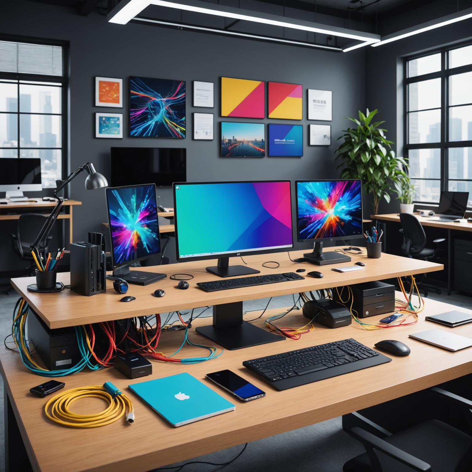 Colored data cables, such as RGB data cables, pair with setups that include a docking station, ergonomic stylus, and multi-screen solutions – making multi-tasking simpler and smoother. Moreover, the cable’s visual appeal enhances the modern workplace environment framed by natural light, greenery, and stylish furnishings for maximum focus and output.