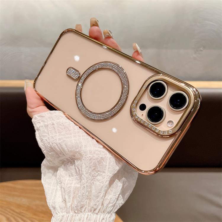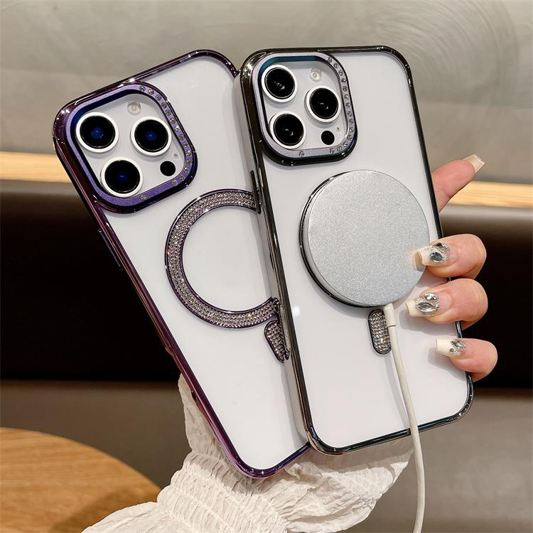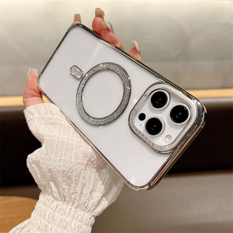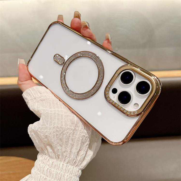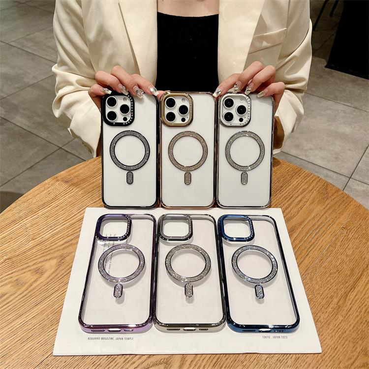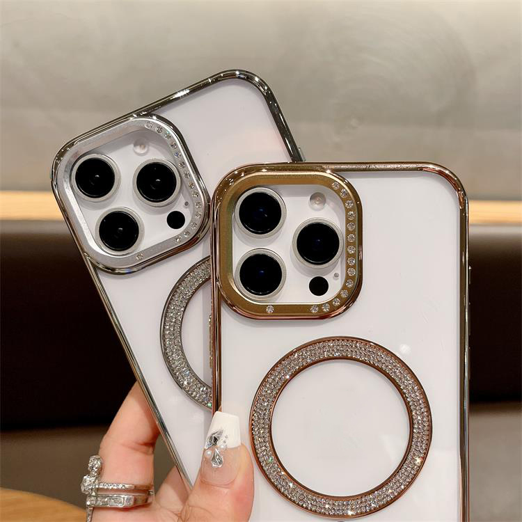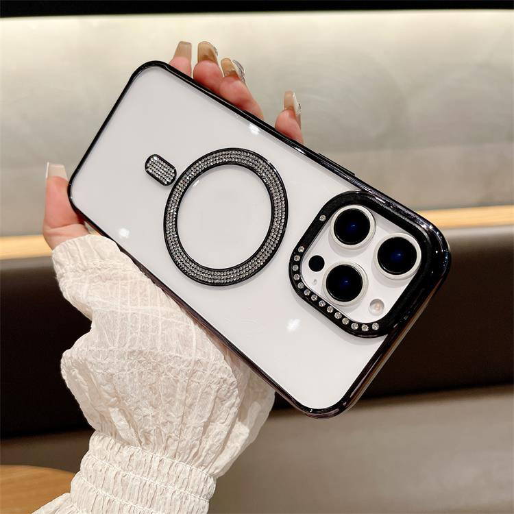 New Electroplating magnetic transparent Phone Case for iPhone 11 12 13 14 15 16 pro max Luxury Rhinestone border phone accessories